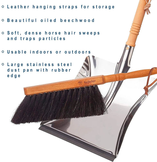 Horsehair Fiber Hand Brush and Dust Pan Set - Wooden Broom and Dustpan Set for Home - Outdoor Dust Pan and Brush - Oiled Beechwood Handles - Large Capacity Stainless Steel Dust Pan